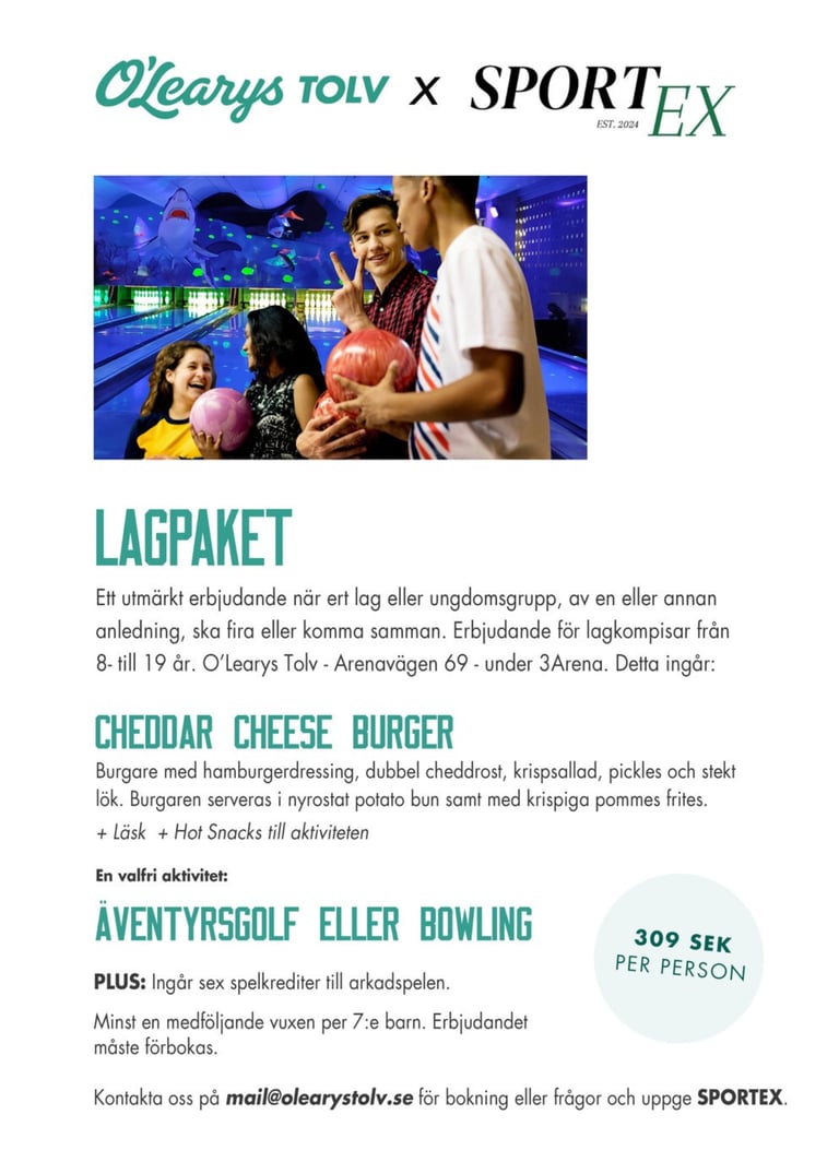 Ett klassiskt svenskt julbord tillsammans med ett bra veganjulbord och en stor lokal fylld med roliga aktiviteter. O'Learys Tolv har allt ni kan tänka er – bowling, shuffleboard, äventyrsgolf, karaokerum och mycket mer. Julbordet dukas upp mellan den 19 november till den 20 december 2025 och välj mellan flera olika aktivitets- mat- och dryckespaket!